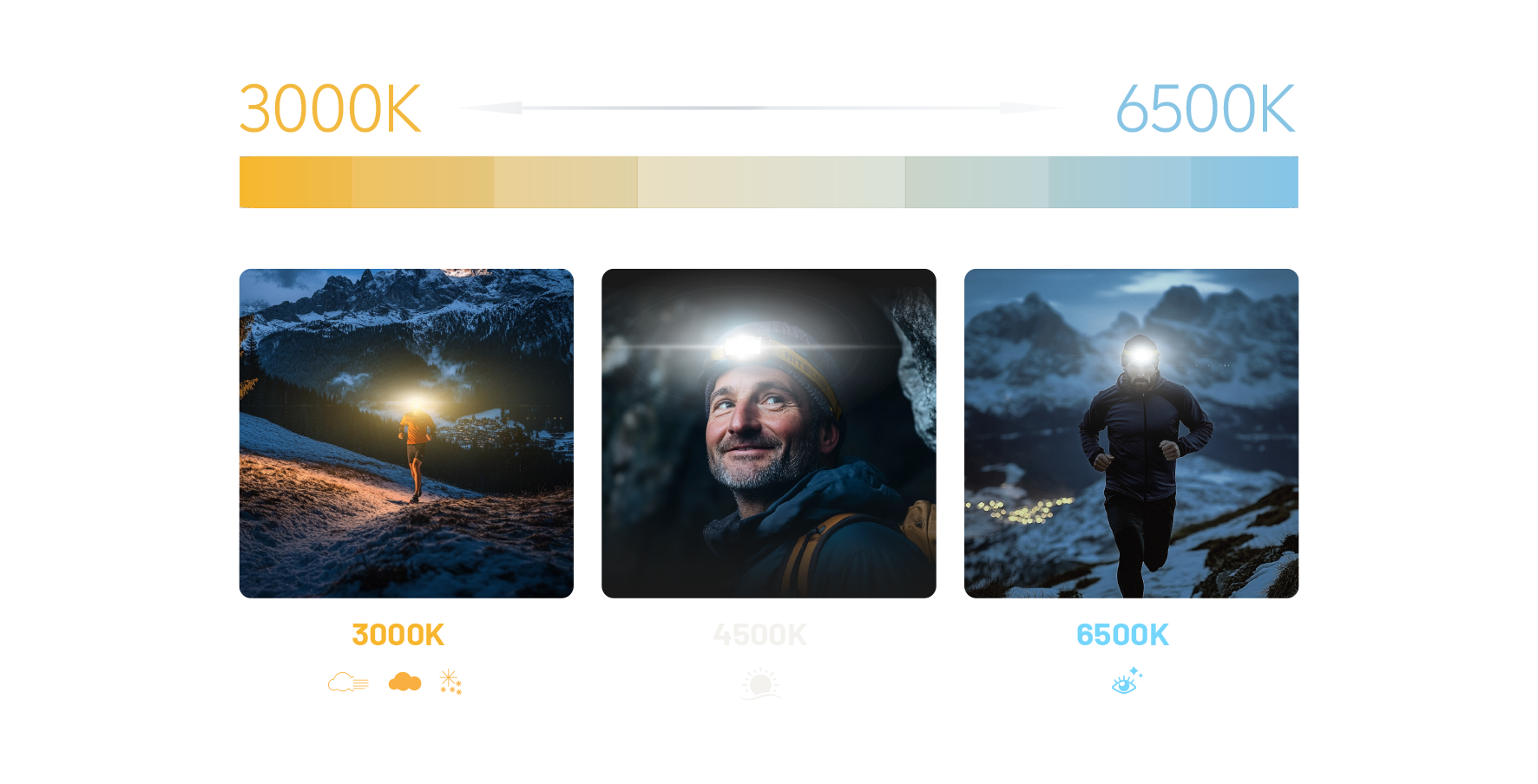 The NITECORE MCT (Multiple Color Temperatures) headlamp provides a wide range of color temperatures, from 3000K warm light to 6500K cool white light, catering to various outdoor lighting needs.