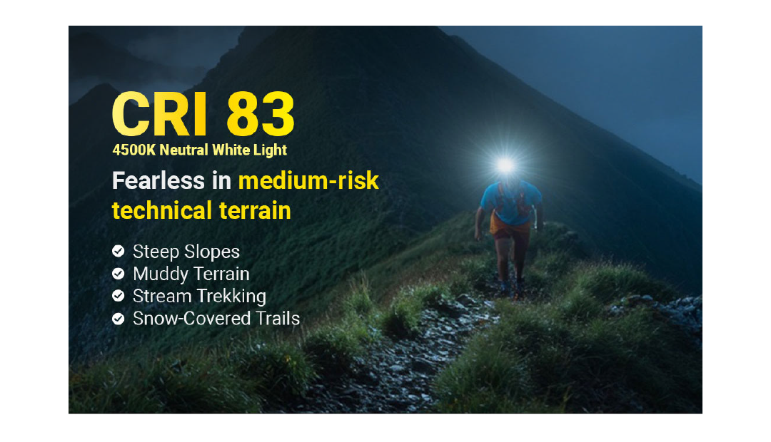 The outdoors is unpredictable, and every situation calls for different lighting. At night, relying on single light source can lead to misjudging terrain, increasing the risk of tripping, stepping into hazards, or missing critical visual cues. The more complex and unpredictable the outdoor environment, the more essential it is to have lighting that offers both high CRI and strong beam penetration. High CRI LEDs are generally costly, consume more power, and generate more heat. After years of real-world research and in-depth reflection on outdoor lighting needs, combined with the strong outdoor demand for high performance, long battery life and lightweight design, NITECORE has arrived at an optimal conclusion: switch to appropriate light source based on the risk level of the outdoor environment.